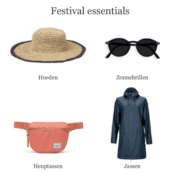 De zomer = festivalperiode. België organiseert massa’s festivals en heeft dus ook een massa festivalliefhebbers. De kans is groot dat jouw doelpubliek daar deze zomer ergens rondhangt. Je kan met je nieuwsbrief algemeen inspelen op het onderwerp of je richten op bepaalde festivals die jouw doelpubliek aantrekken. Denk aan de grotere (Rock Werchter, Gent Jazz, Pukkelpop, Tomorrowland) of de populaire festivals in de buurt van jouw winkel. JUTTU speelt hier mooi op in en geeft tips voor onmisbare items op festivals.